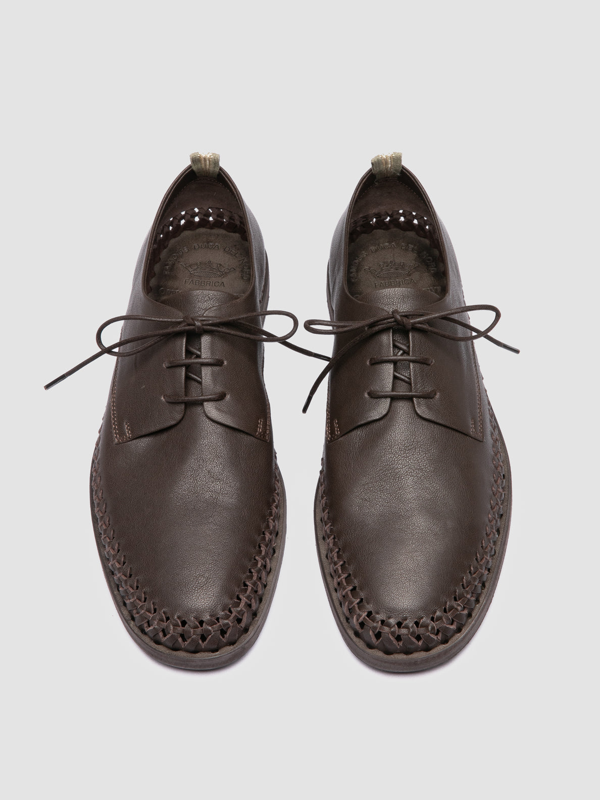 Perfect for a sophisticated summer casual style our Miles derby shoes catch the eye thanks to the woven detail along the edges of the dark brown leather upper. Made entirely by hand they feature a rounded toe thin waxed laces grosgrain heel loop tab and a flat leather stacked sole.