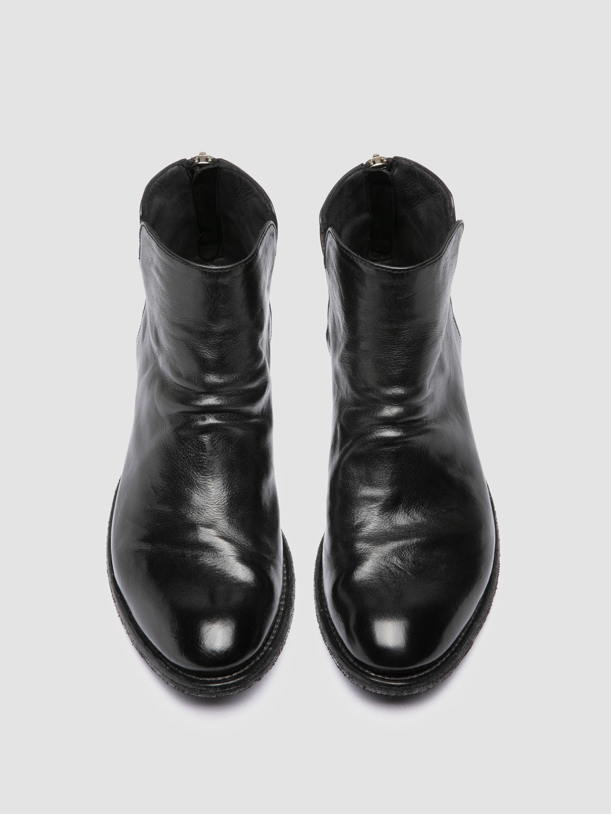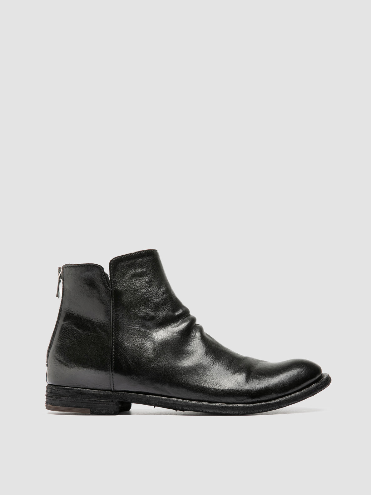 The Lexikon 555 zipped ankle boots are handcrafted in Italy from black leather. Featuring a distressed silhouette with a slightly curved toe, they’re designed with a rear zip for ease and a stacked leather sole with rubber insert.