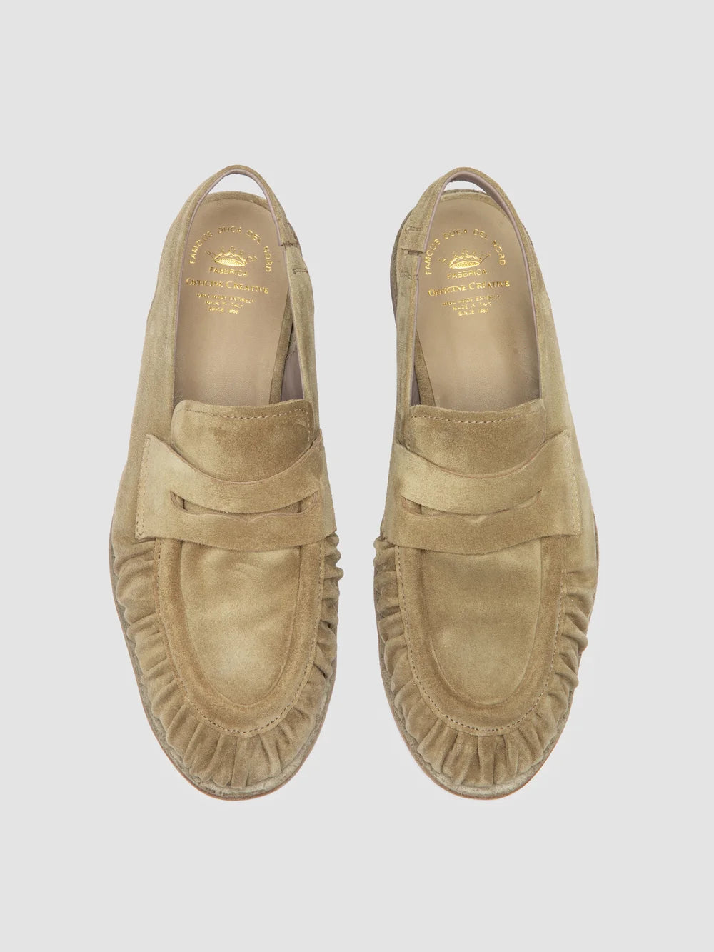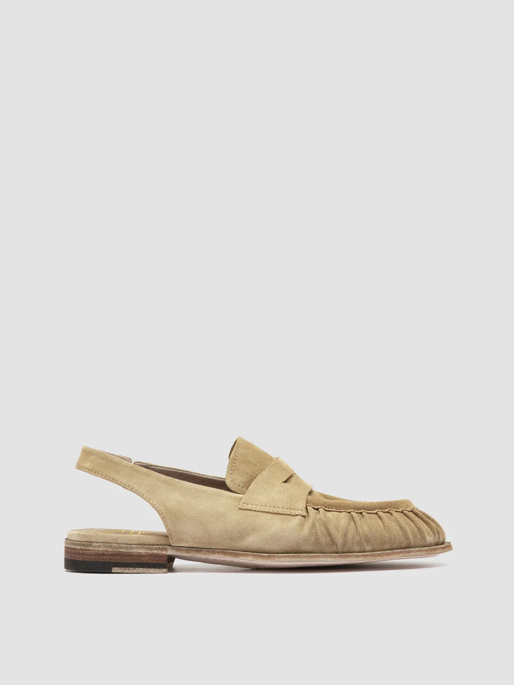 The Solitude 102 sandals reinterpret the classic penny loafer with a contemporary twist. Handcrafted from beige suede, they feature a gathered texture along the upper, while the elasticated slingback strap ensures a secure fit.