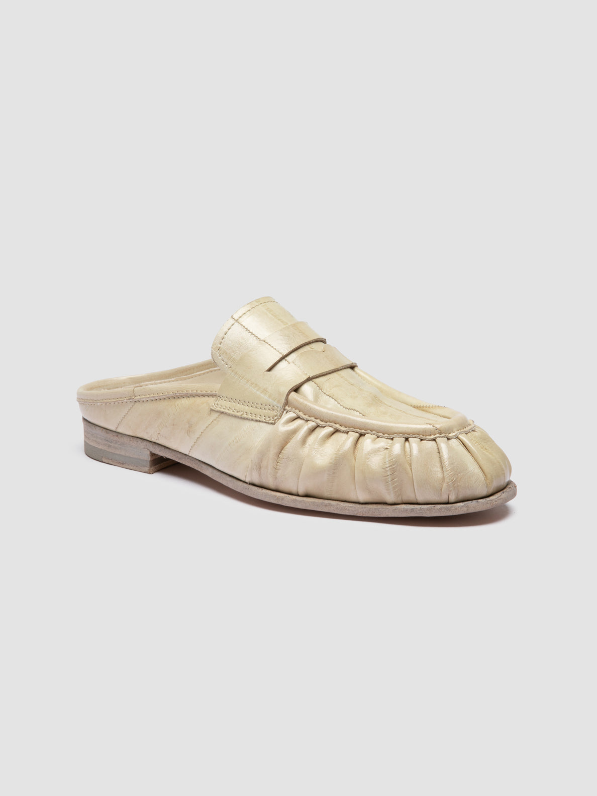 The Solitude 112 sandals are handcrafted in Italy from premium white leather. Designed with a distinctive ruched toe and classic penny loafer vamp, they combine traditional detailing with a contemporary backless silhouette.