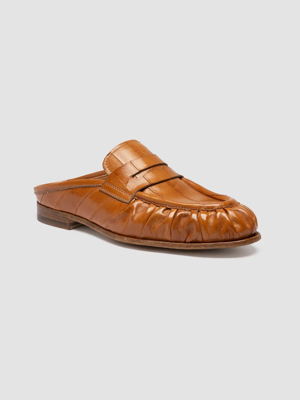 The Solitude 112 sandals are handcrafted in Italy from premium orange leather. Designed with a distinctive ruched toe and classic penny loafer vamp, they combine traditional detailing with a contemporary backless silhouette.